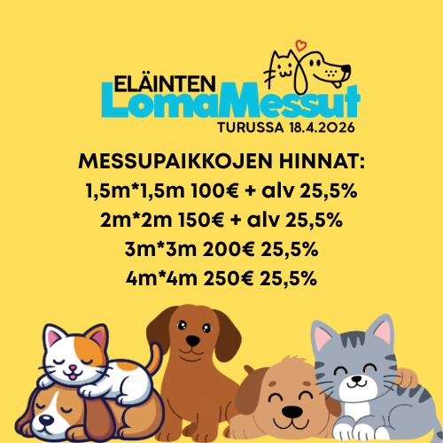 Lähetettyäsi lomakkeen olet alustavasti ilmoittautunut Eläinten LomaMessuille, jotka järjestetään Tallink Siljan terminaalissa lauantaina 18.4.2026 kello 9–16. Ilmoittautumisen päätyttyä saat muutaman viikon kuluessa lisäinfoa, vahvistuksen ja laskun varausmaksun maksamiseen. Muut ohjeet, aikataulut ym. tulevat myöhemmin sähköpostiin.